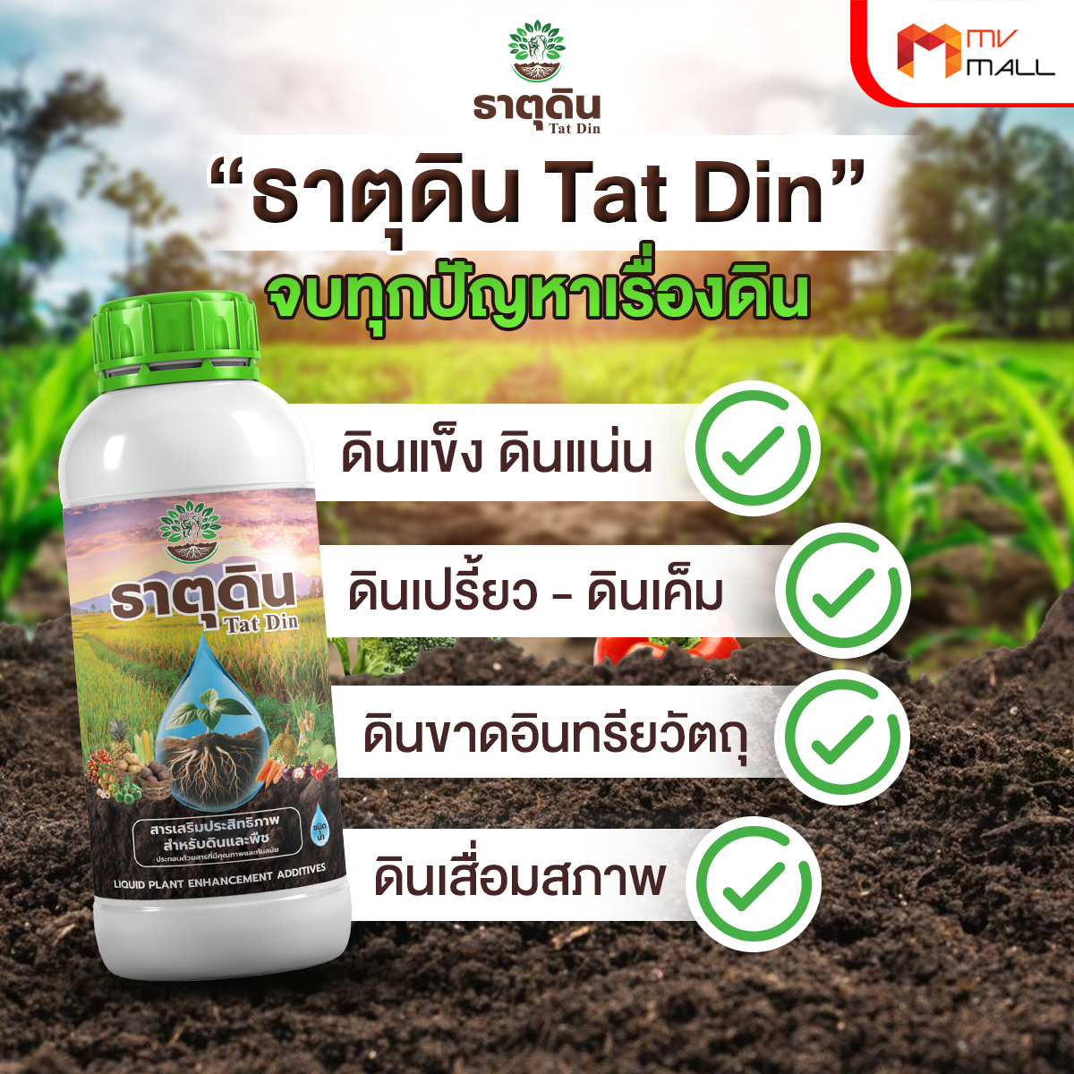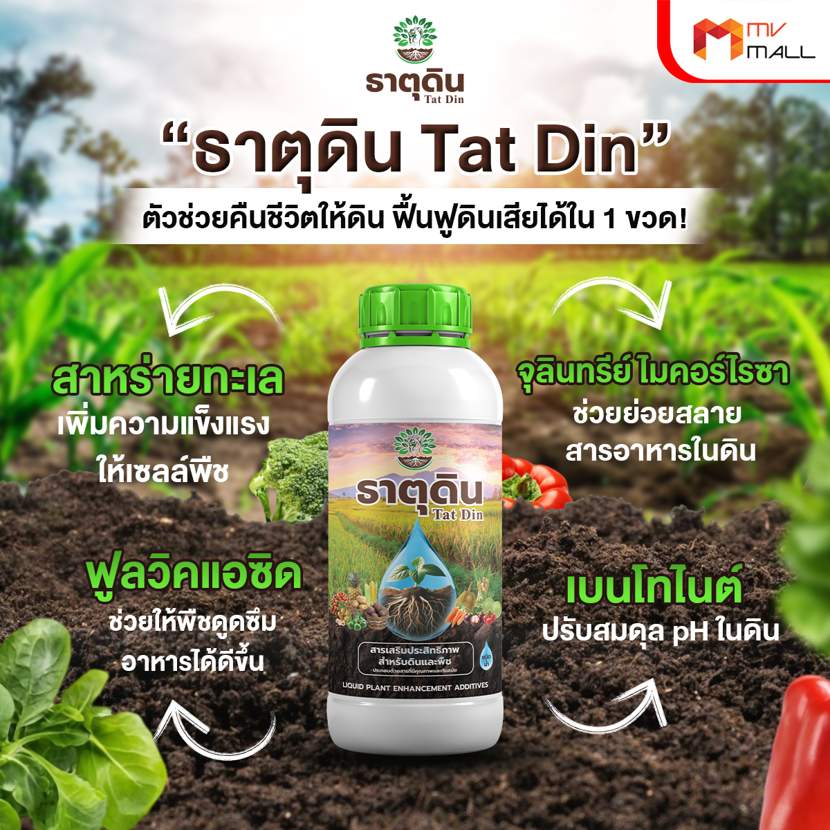 ธาตุดิน จุลินทรีย์ย่อยสลายปรับปรุงดิน รับฟื้นคืนชีพพืชที่กำลังจะตาย ขั้นโคม่า เพราะมี ฟูลวิคและสาหร่าย (มี n mg zn) ช่วยสังเคราะห์ไนโตรเจน เสริมการแตกราก แตกใบ แตกยอด เพิ่มธาตุอาหารให้ดิน และปรับสภาพดินให้เป็นกลาง (PH 5-7.5) ทำให้รากดูดซึมธาตุอาหารได้ดี จบทุกปัญหาเรื่องดิน!! สูตรเข้มข้นมาก ลดต้นทุนได้มาก เห็นผลมาก ปลอดสารเคมี (เป็นอินทรี ไม่ใช่ เคมี) ไม่เป็นอันตรายทั้งผู้ใช้ และผลผลิต