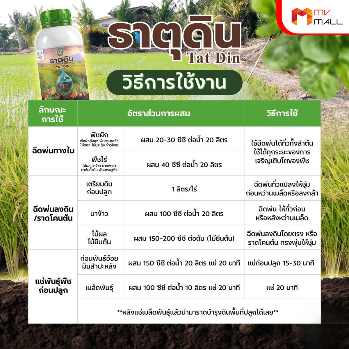 - เตรียมดินก่อนปลูก ใช้อัตราส่วนผสม 1 ลิตร/ไร่