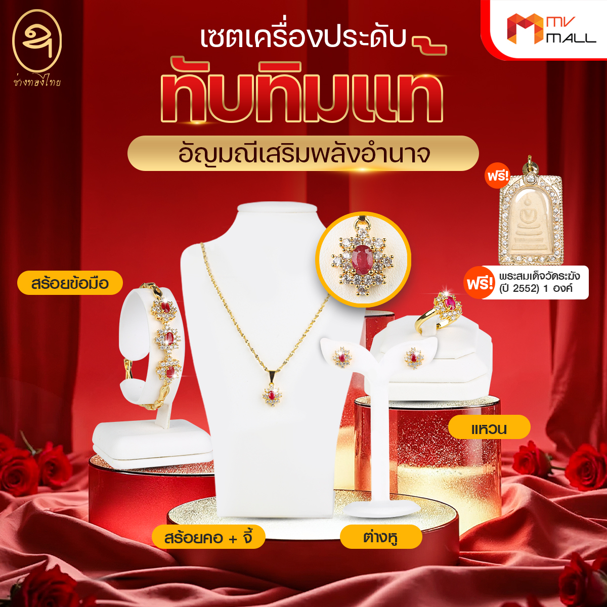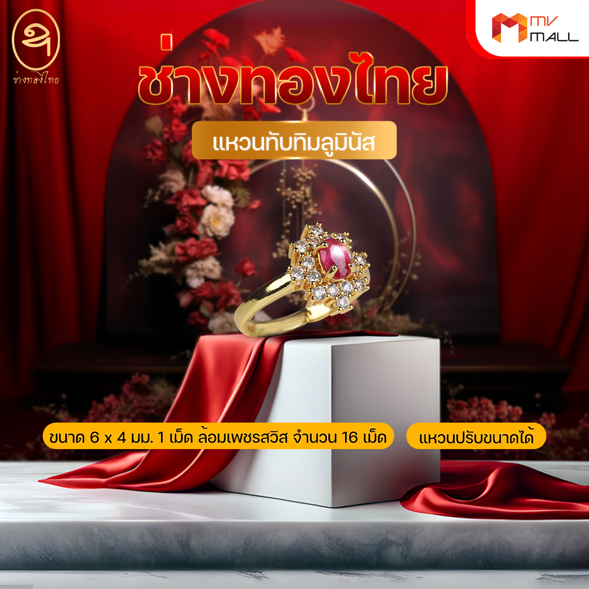 - ขนาด 6 x 4 มม. 1 เม็ด ล้อมด้วยเพชรสวิส จำนวน 16 เม็ด