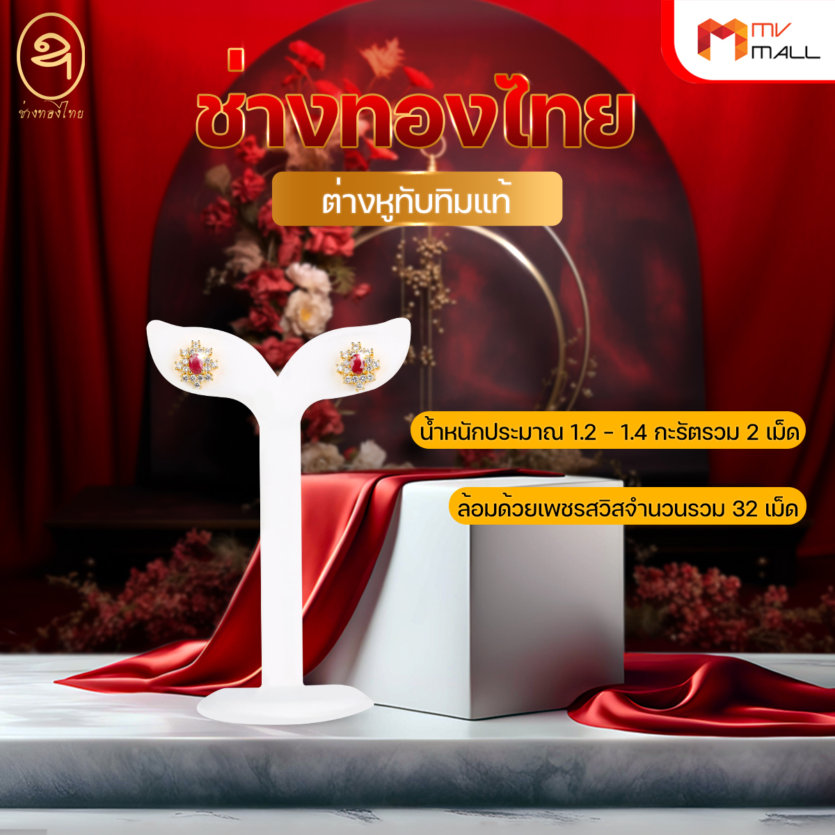 - น้ำหนักประมาณ 1.2 – 1.4 กะรัตรวม 2 เม็ด ล้อมด้วยเพชรสวิสจำนวนรวม 32 เม็ด