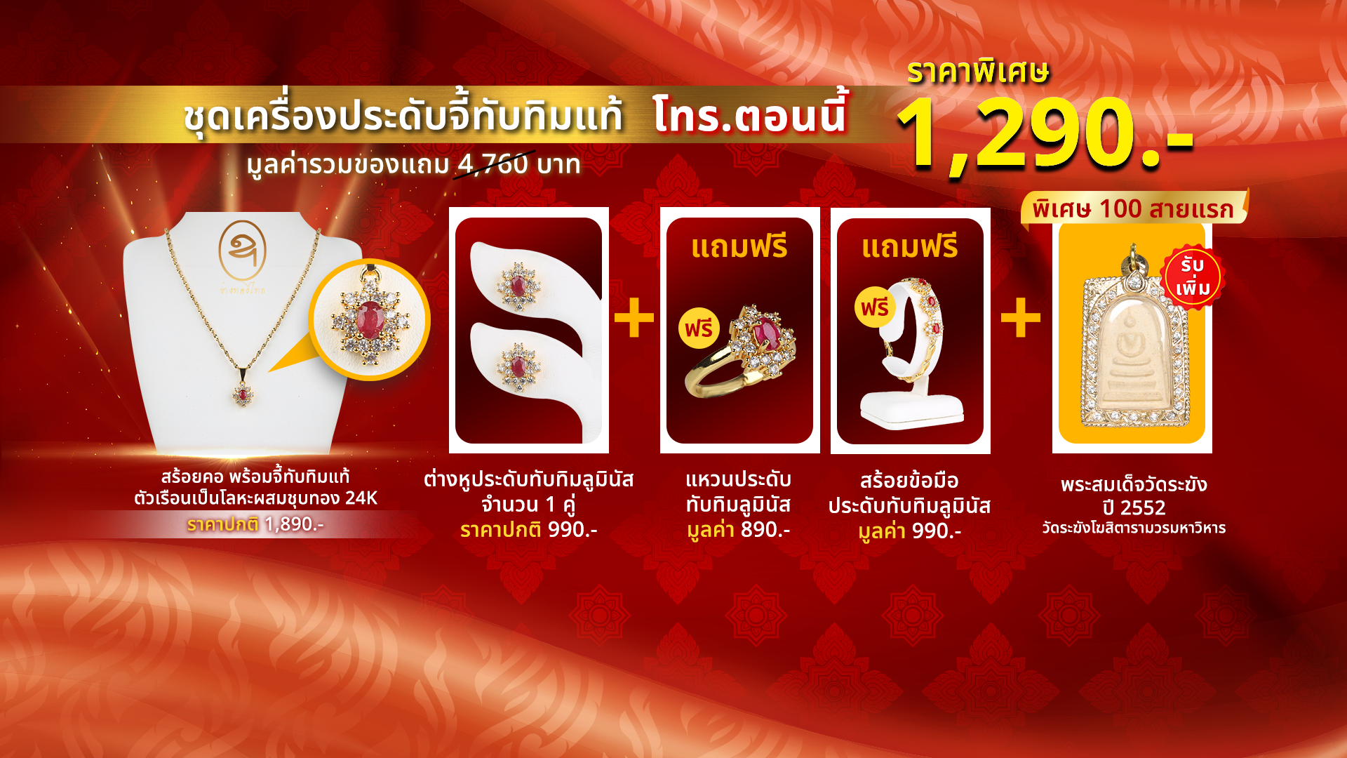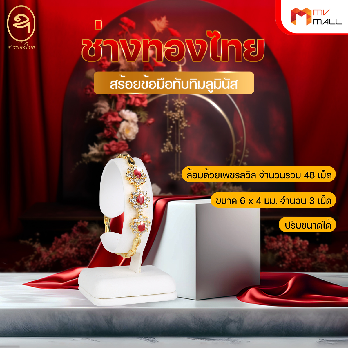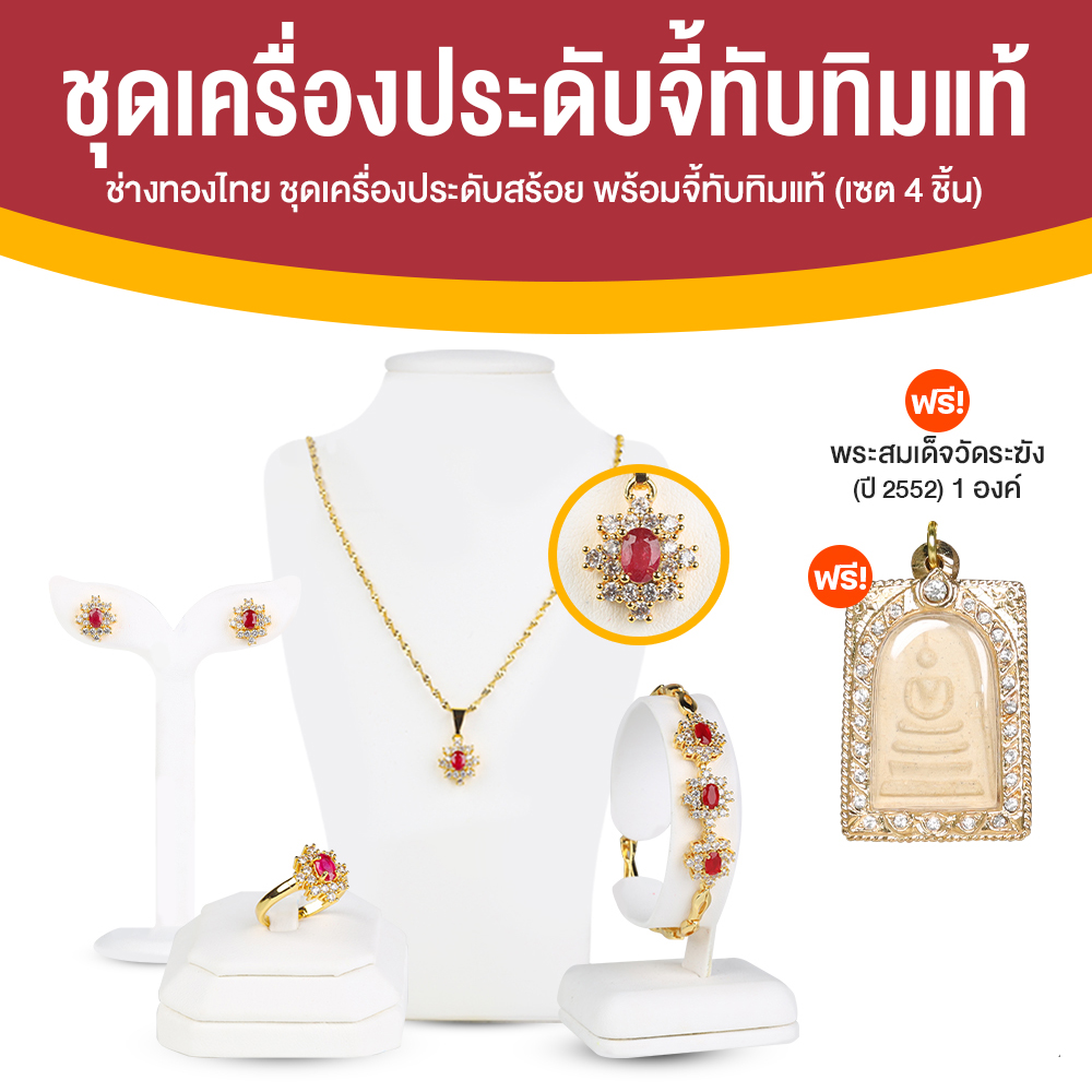 - ขนาด 6 x 4 มม. จำนวน 3 เม็ด ล้อมด้วยเพชรสวิส จำนวนรวม 48 เม็ด