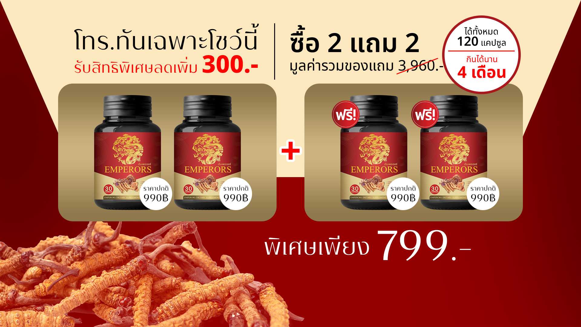เอ็มเพอเรอร์ (Emperors) ผลิตภัณฑ์เสริมอาหารบำรุงสุขภาพจากถั่งเช่า ขนาด 30 แคปซูล จำนวน 4 กระปุก