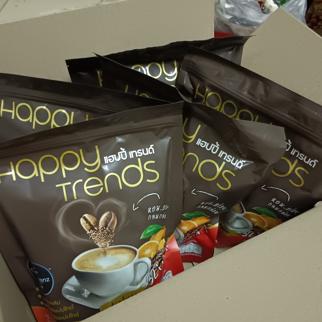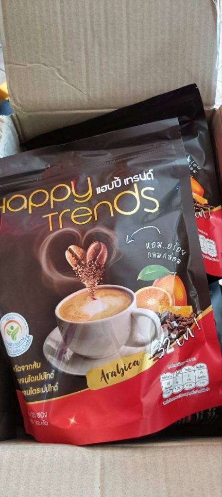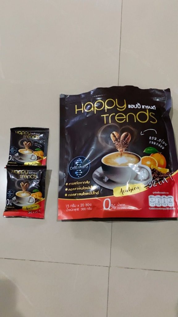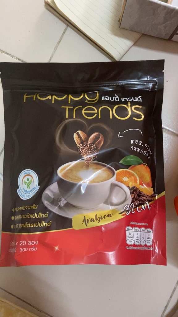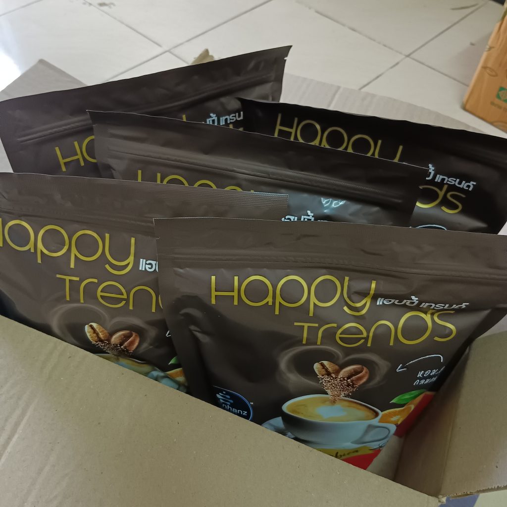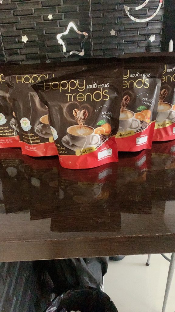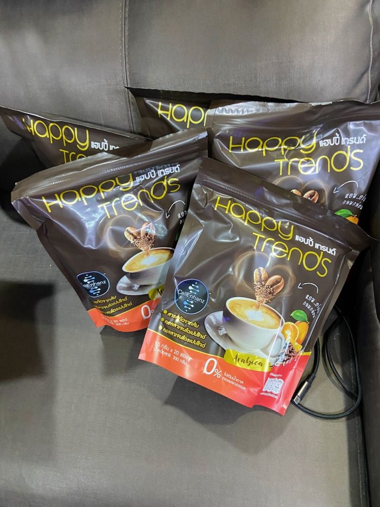 กาแฟแฮ็ปปี้เทรนด์กลิ่นหอมรสชาติอร่อยมากไม่ต้องหวานมากรสนี้แหละที่อร่อยกาแฟเข้มข้นดีดื่มวันละสองซองเช้าบ่ายมีคุณภาพคับแก้ว
