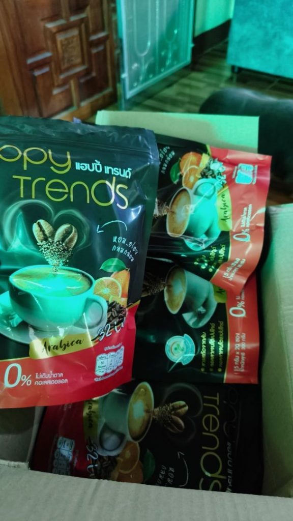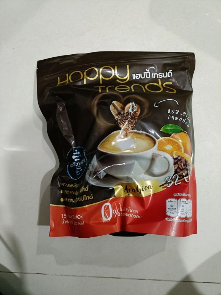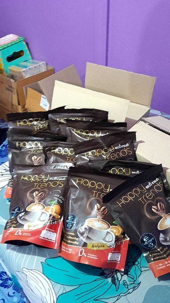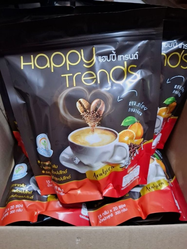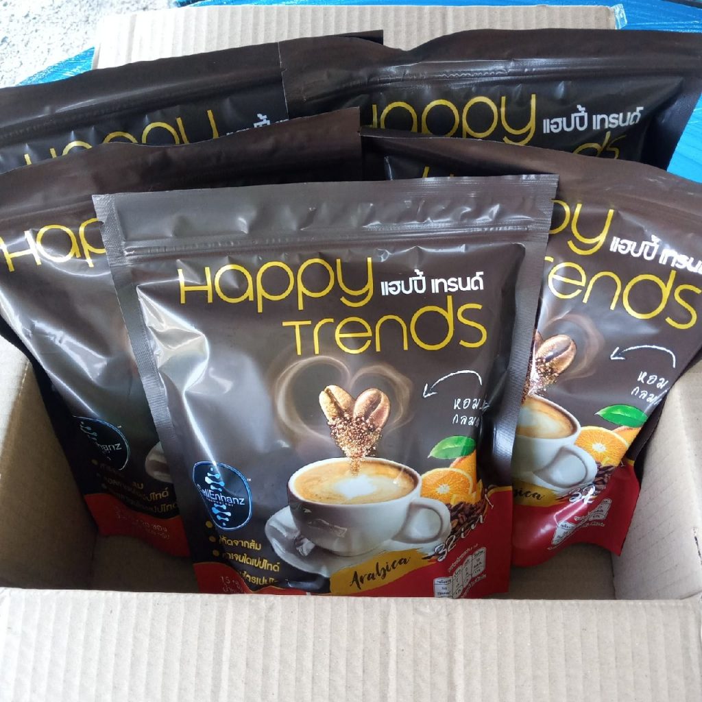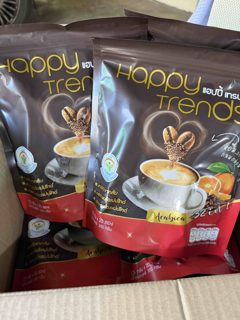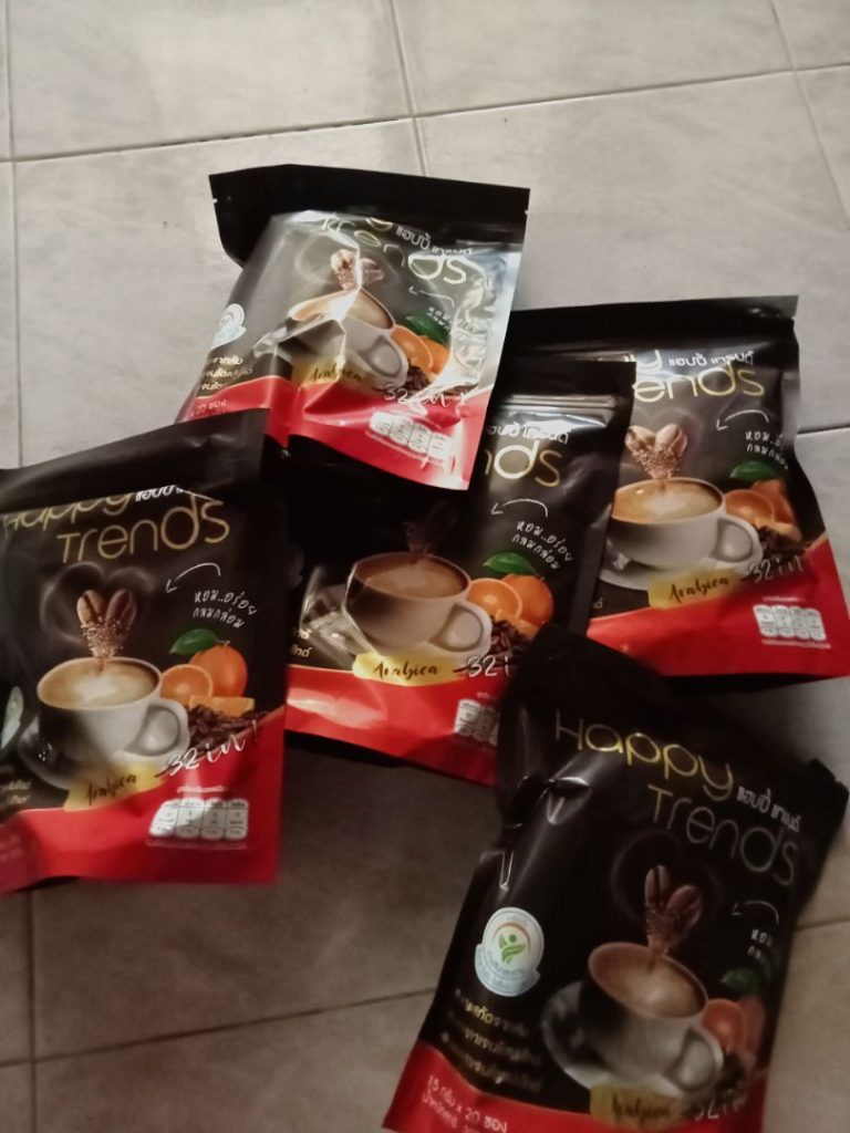 กาแฟแฮ็ปปี้เทรนด์กลิ่นหอมรสชาติอร่อยมากไม่ต้องหวานมากรสนี้แหละที่อร่อยกาแฟเข้มข้นดีดื่มวันละสองซองเช้าบ่ายมีคุณภาพคับแก้ว