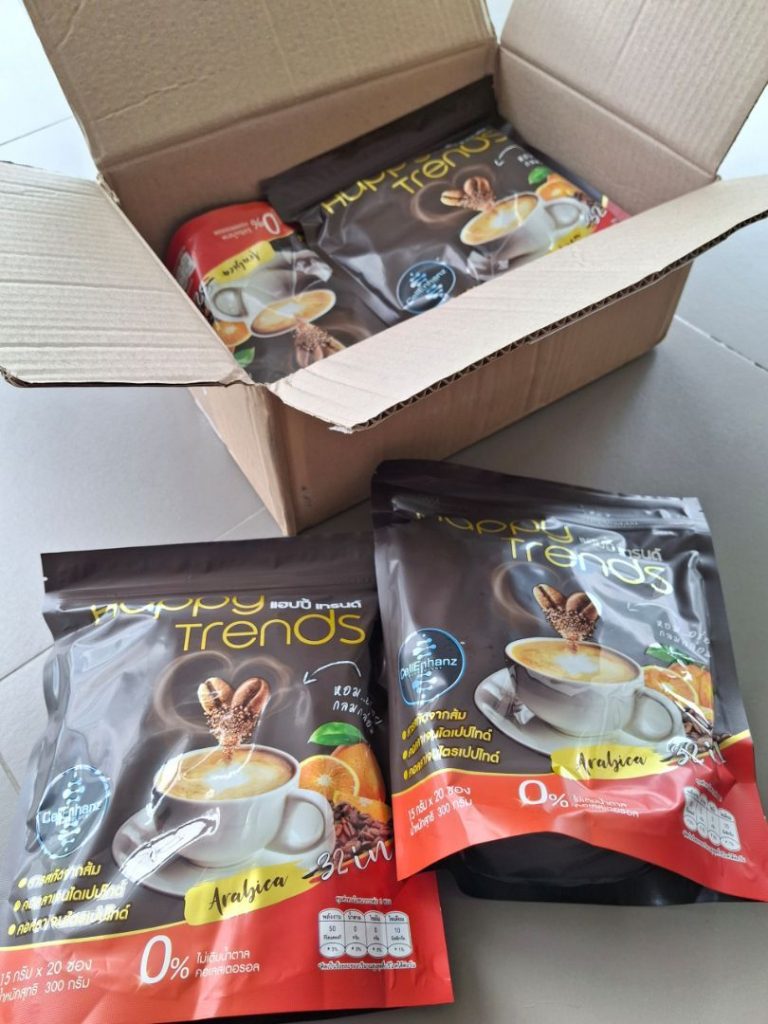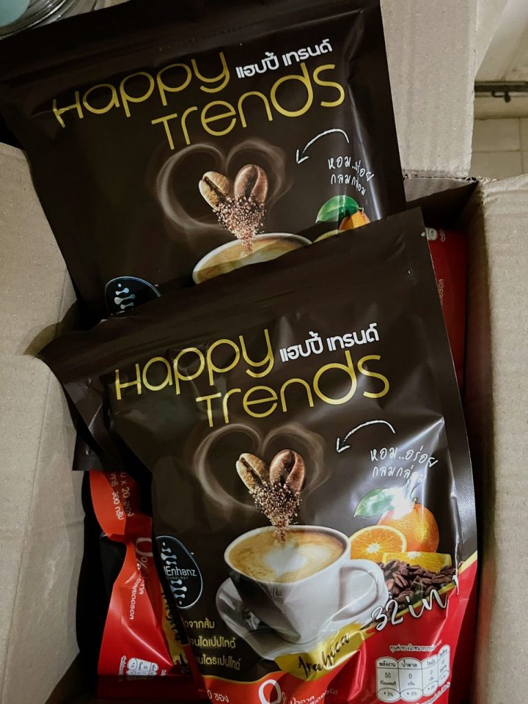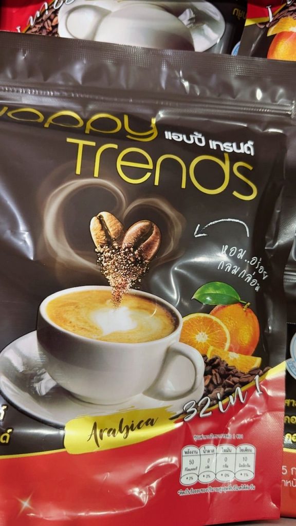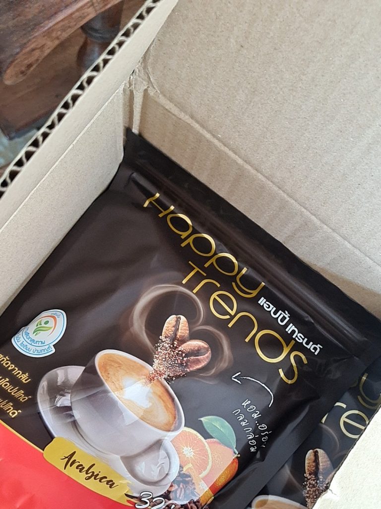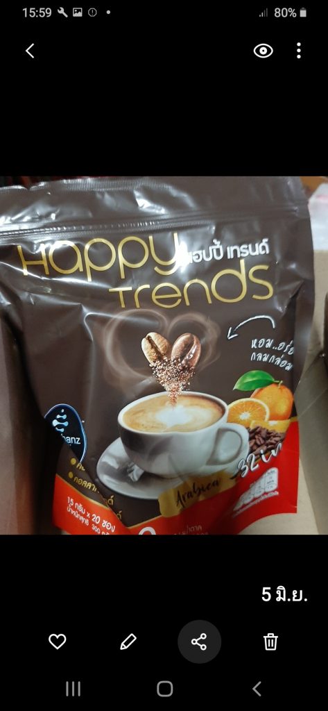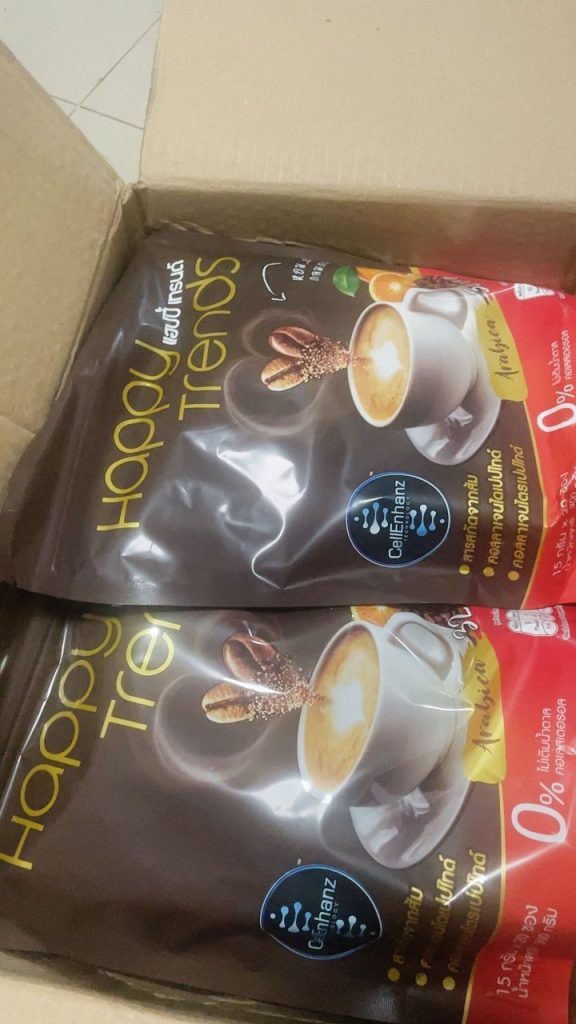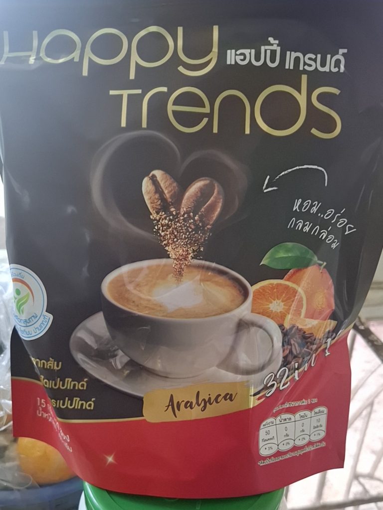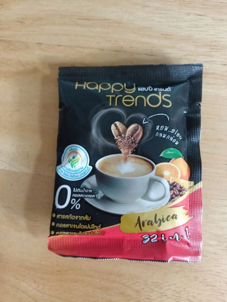 กาแฟแฮ็ปปี้เทรนด์กลิ่นหอมรสชาติอร่อยมากไม่ต้องหวานมากรสนี้แหละที่อร่อยกาแฟเข้มข้นดีดื่มวันละสองซองเช้าบ่ายมีคุณภาพคับแก้ว