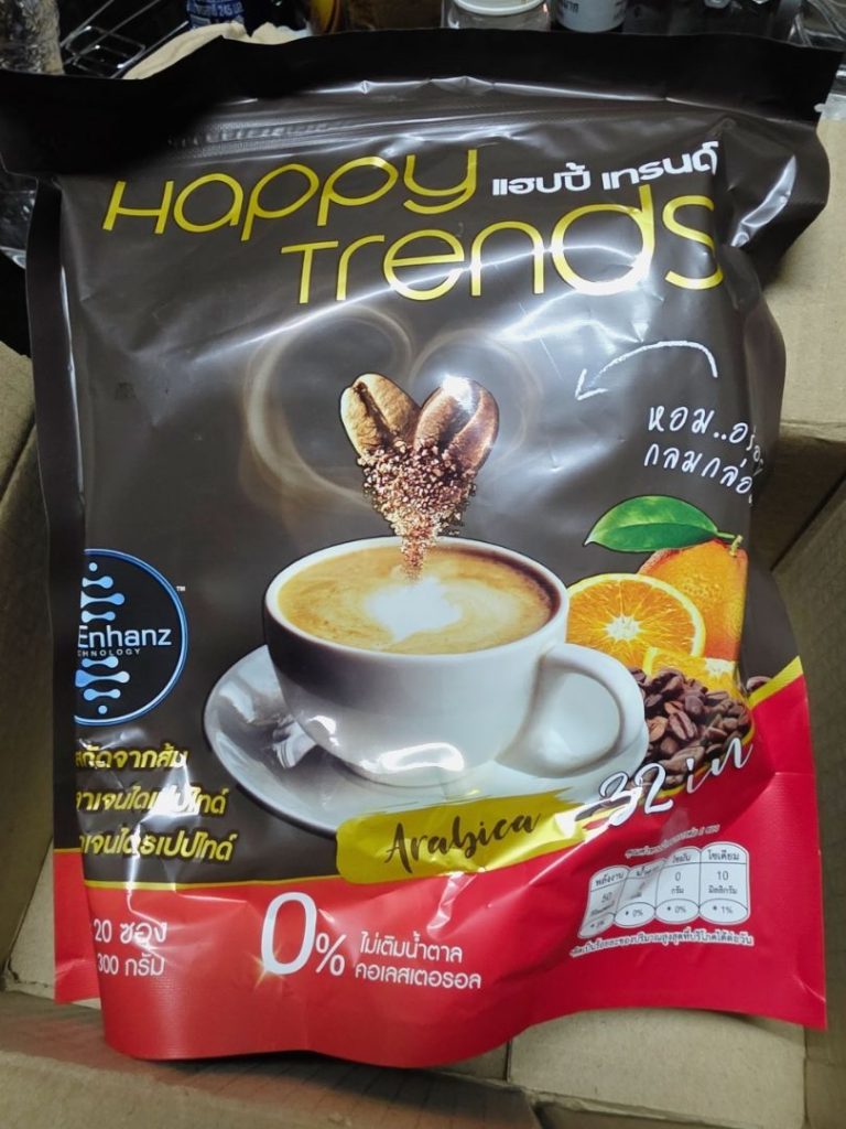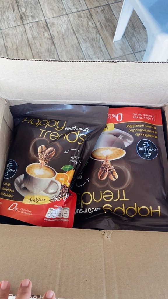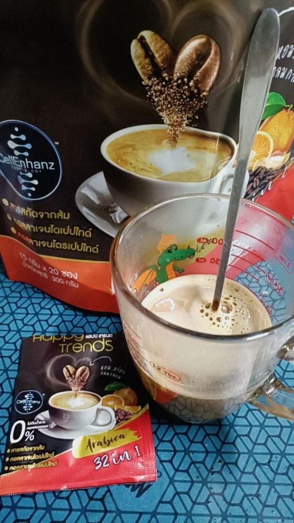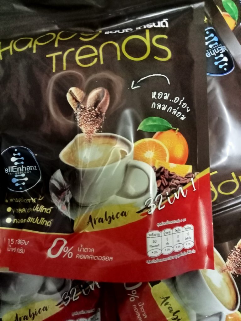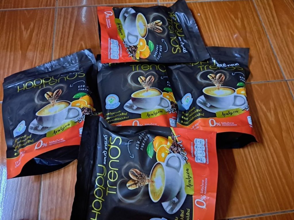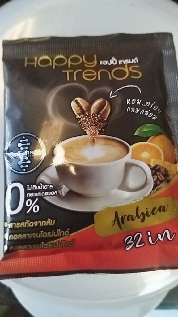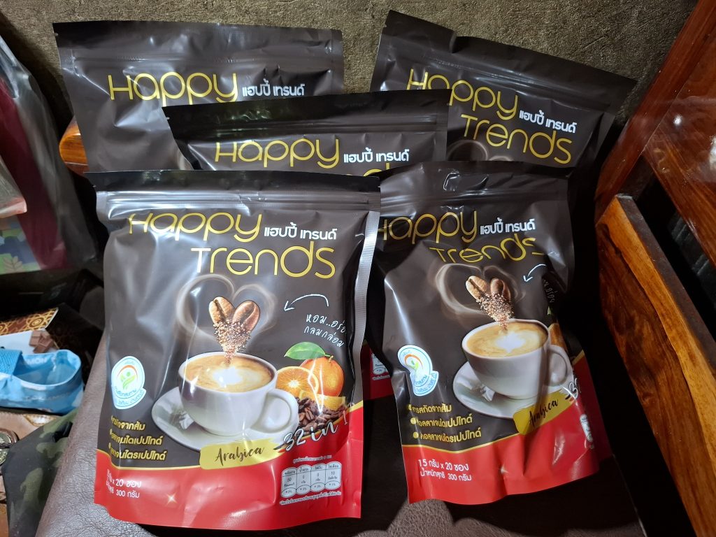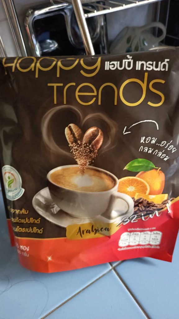 กาแฟแฮ็ปปี้เทรนด์กลิ่นหอมรสชาติอร่อยมากไม่ต้องหวานมากรสนี้แหละที่อร่อยกาแฟเข้มข้นดีดื่มวันละสองซองเช้าบ่ายมีคุณภาพคับแก้ว