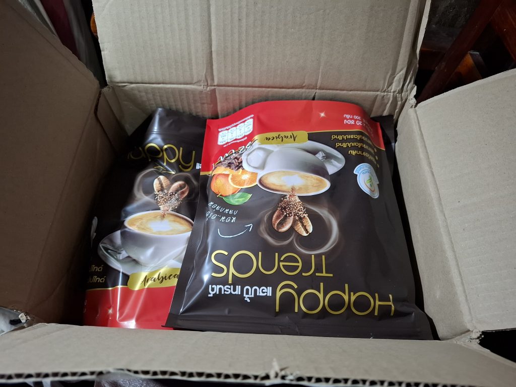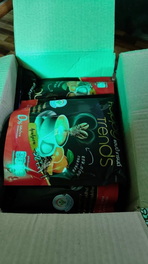 ได้รับกาแฟแล้ว ส่งเร็วมากเป็นกาแฟที่หอมกลิ่นอารบิกก้ากินแล้วอิ่มนานสั่งมาทั้งหมดห้าถุงใหญ่ หนึ่งถุงมี 20 ซอง = 100ซองเล็ก