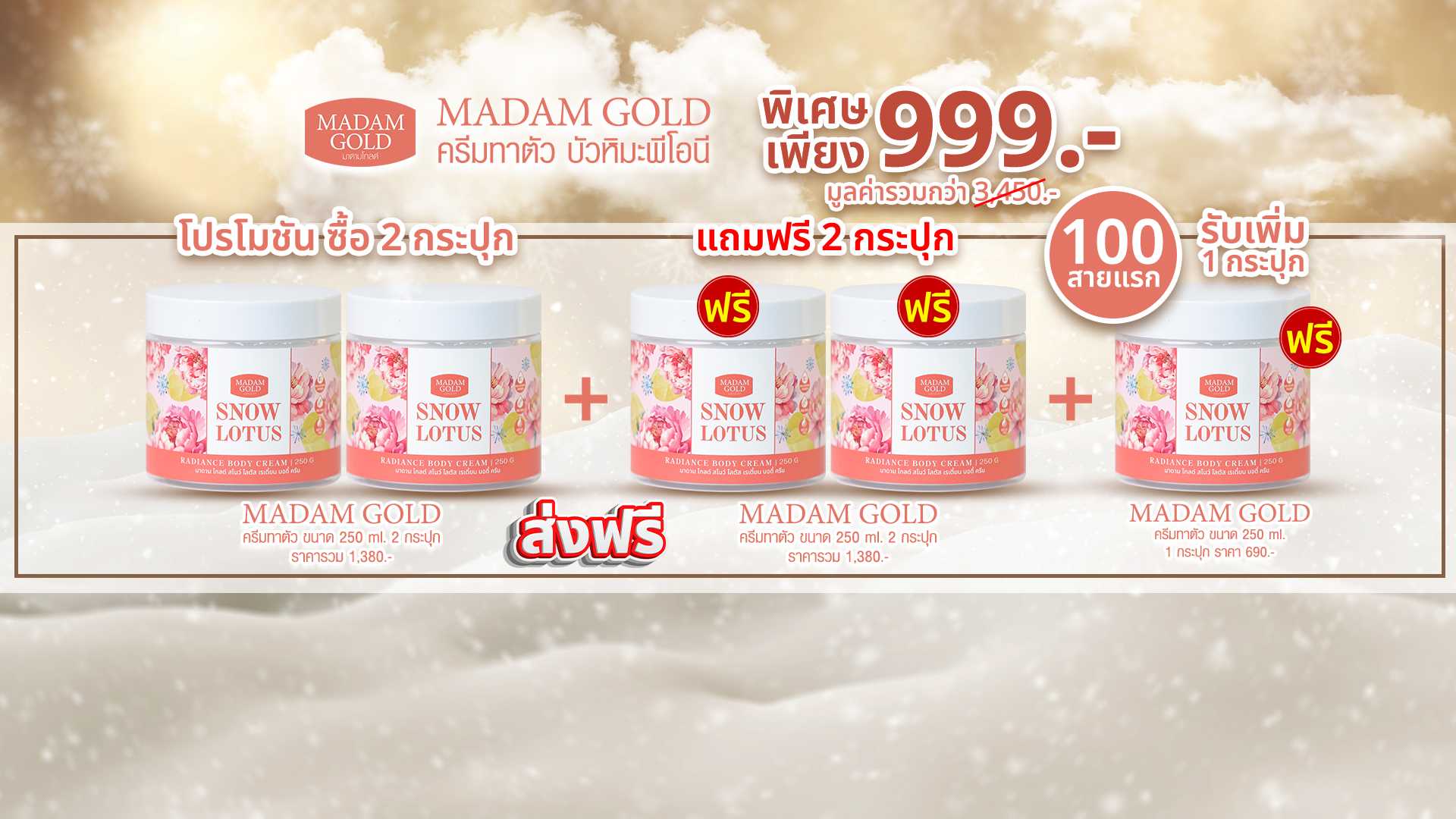 Madam Gold ครีมทาตัวบัวหิมะพีโอนี เพิ่มความชุ่มชื้นให้ผิวถึงขีดสุด ลดผิวแห้งแตก ลดความแห้งกร้าน ผิวหยาบ สาก ช่วยให้ผิวกลับมาเนียนนุ่ม ชุ่มชื้น กระจ่างใส ฟื้นผิวขาลาย จุดด่างดำ ให้สีผิวดูสม่ำเสมอ ลดการเกิดขนคุด ผิวไม่เรียบเนียน ผลัดเซลล์ผิวอย่างอ่อนโยน