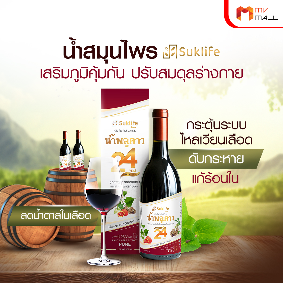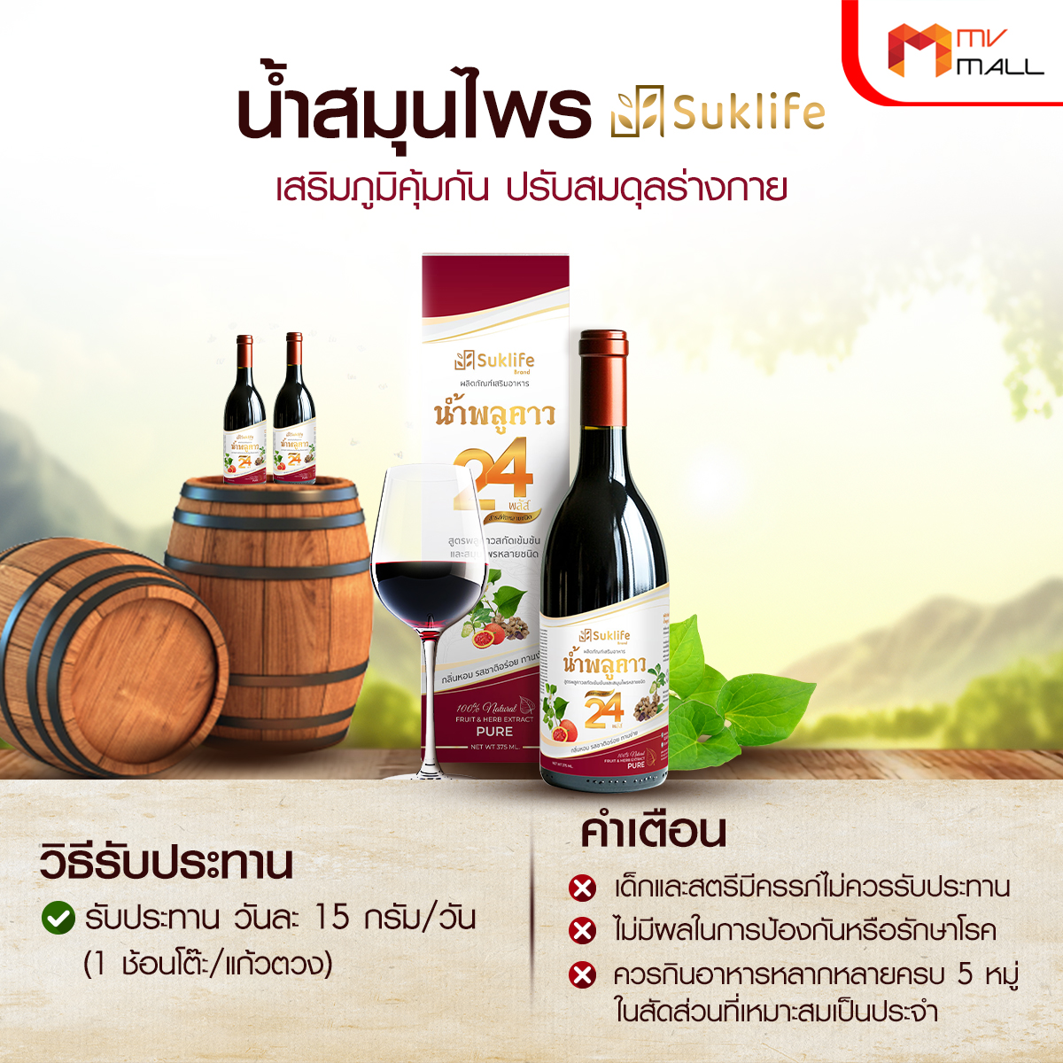 - น้ำสมุนไพรเข้มข้นที่รวมพลังสมุนไพรจากธรรมชาติกว่า 24 ชนิด ช่วยเสริมภูมิคุ้มกัน ต่อต้านไวรัส แบคทีเรีย และลดการอักเสบในร่างกาย เหมาะสำหรับผู้ที่ต้องการดูแลสุขภาพแบบองค์รวม