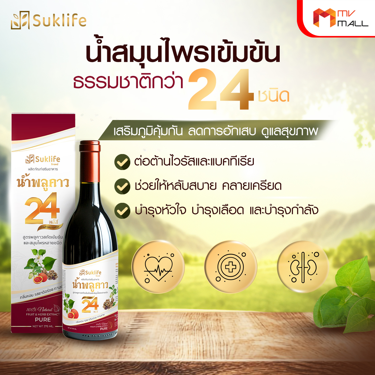 • น้ำสมุนไพรเข้มข้นที่รวมพลังสมุนไพรจากธรรมชาติกว่า 24 ชนิด ช่วยเสริมภูมิคุ้มกัน ต่อต้านไวรัส แบคทีเรีย และลดการอักเสบในร่างกาย เหมาะสำหรับผู้ที่ต้องการดูแลสุขภาพแบบองค์รวม